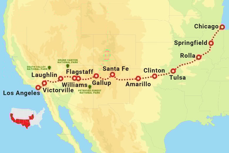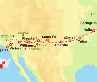 O tour pela Rota 66 é uma incrível jornada de 15 dias ao longo da famosa "Mother Road". Começando em Chicago, IL, você percorrerá cerca de 3800 km até chegar a Los Angeles, CA. Durante essa viagem, você atravessará 8 estados, incluindo Illinois, Missouri, Oklahoma, Texas, Novo México, Arizona e Califórnia, com paradas em cidades históricas e belas ao longo do caminho. Essa experiência oferece uma perspectiva única sobre o Midwest americano dos anos 50, enquanto você pilota sua motocicleta, conversível, motorhome pelas Ozarca Mountains, terras indígenas do "velho oeste" em Oklahoma e atravessa as vastas planícies Great Plains. Você também passará pela encantadora cidade de Santa Fe, NM, com seus 400 anos de história, antes de chegar a Nevada, conhecida por seus cassinos, e à cidade de Laughlin. Ao final, em Los Angeles, você terá vivenciado o melhor e o mais autêntico da América, explorando a lendária Rota 66.